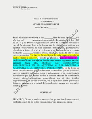 Este documento es un auto de conocimiento tipo I emitido por un rector. Resuelve citar inmediatamente a las partes involucradas en un conflicto para oír sus puntos de vista y buscar la reparación de daños y reconciliación. También ordena informar a los padres de los estudiantes, realizar seguimiento del caso por cuatro meses, y notificar a los mediadores escolares para que participen en el proceso.