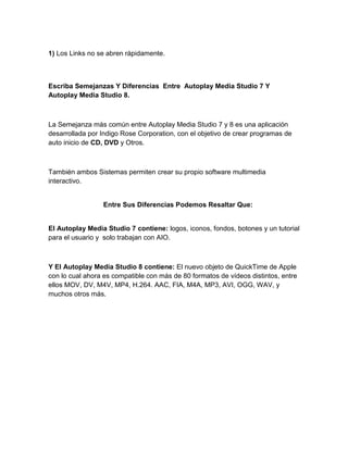 Autoplay Media Studio 7 y 8 son aplicaciones desarrolladas por Indigo Rose Corporation para crear programas de auto inicio interactivos en CD/DVD. Ambos permiten crear software multimedia personalizable, pero se diferencian en los formatos de video compatibles y elementos incluidos. El Studio 8 admite más formatos de video gracias al objeto QuickTime de Apple.