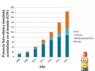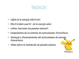 Este documento describe los componentes y funcionamiento de un sistema de autoconsumo fotovoltaico para generar energía eléctrica a partir de la energía solar. Explica que los paneles solares contienen células de silicio que generan electricidad cuando son bombardeadas por fotones de luz solar, y que estas células se conectan en serie para producir un voltaje adecuado. También analiza las ventajas como el ahorro y la sostenibilidad, e inconvenientes como el espacio y coste requeridos para el almacenamiento de energía