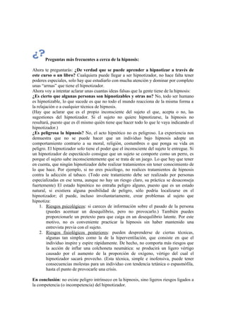 1. El documento presenta un curso de hipnosis impartido por Juan de Dios, un estudiante de 21 años. 2. Explica los tres estados de hipnosis (Z1, Z2 y Z3) y las sugestiones que pueden aceptarse en cada estado. 3. Advierte sobre posibles riesgos de la hipnosis y la importancia de realizar una entrevista previa para evitarlos.