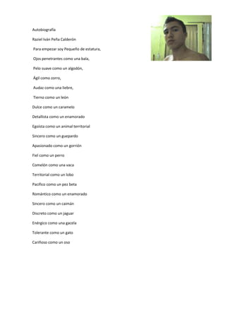 Este breve poema autobiográfico describe las características físicas y de personalidad del autor, Raziel Iván Peña Calderón, comparándolo con varios animales. Se describe a sí mismo como pequeño pero ágil, audaz pero tierno, dulce pero territorial, apasionado pero fiel, pacífico pero enérgico.