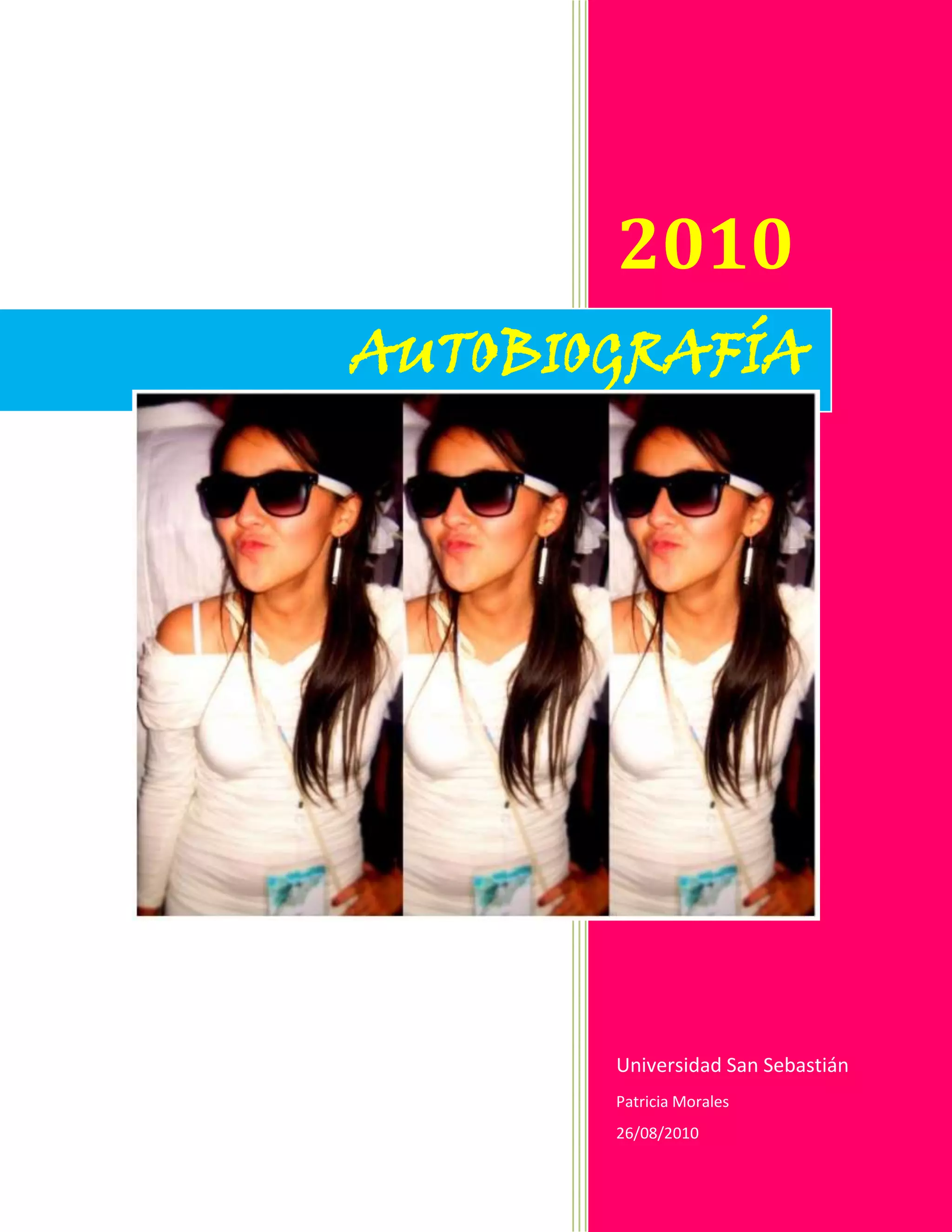 Este documento es la autobiografía de Patricia Morales. Presenta información sobre su familia, incluyendo que es la menor de cuatro hermanos. También describe sus estudios, personalidad, gustos como sacar fotos, y su relación de un año con su novio Iván. Su sueño es viajar por el mundo.