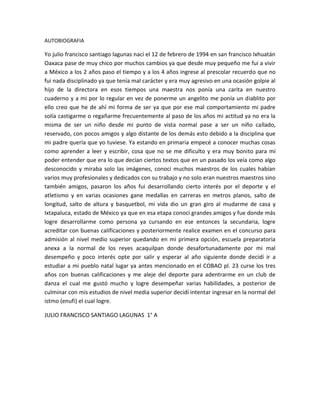 Julio Francisco Santiago Lagunas nació en 1994 en San Francisco Ixhuatán, Oaxaca. Se mudó a México a los 2 años y asistió al preescolar, donde tuvo problemas de disciplina. En la primaria aprendió a leer y escribir y desarrolló intereses en los deportes. Se mudó a Ixtapaluca, donde hizo buenos amigos y se desarrolló como persona. Aprobó el examen de admisión a la preparatoria Anexa a la Normal de los Reyes Acaquilpan pero optó por salirse. Más