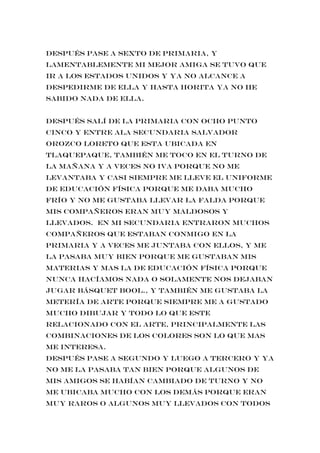 Jennifer Corina Vázquez Ortiz narra su autobiografía desde su nacimiento en 1992 hasta el presente. Creció en Tonalá, Jalisco con sus padres y dos hermanos. Asistió a la primaria y secundaria donde disfrutó de sus amigos y materias favoritas como educación física y arte. Actualmente asiste a la preparatoria donde se esfuerza por pasar sus materias a pesar de las dificultades con el estudio y la distancia de su casa.
