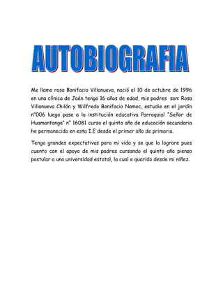Rosa Bonifacio Villanueva nació el 10 de octubre de 1996 en Jaén, Perú. Actualmente tiene 16 años y estudia quinto año de secundaria en la institución educativa Parroquial “Señor de Huamantanga”. Sus padres son Rosa Villanueva Chilón y Wilfredo Bonifacio Namoc. Ella espera postular a una universidad estatal con el apoyo de sus padres.