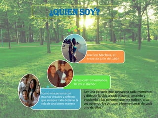 El documento presenta una breve autobiografía de una persona nacida en Machala, Ecuador en 1992. Es el menor de cuatro hermanos y se describe a sí mismo como alguien con virtudes y defectos que trata de llevar una buena vida aprovechando cada momento e interactuando positivamente con los demás. Sus deseos para el futuro incluyen pasar más tiempo con su familia, formar su propia familia basada en el amor y la confianza, y continuar compartiendo experiencias con sus hermanos.