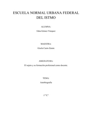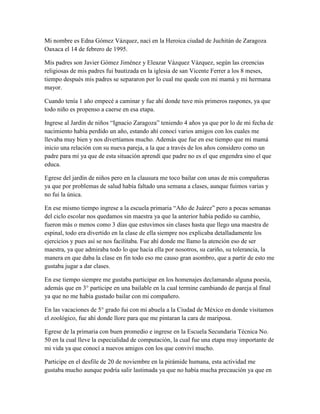 Edna Gómez Vázquez nació en 1995 en Oaxaca, México. Creció con su madre y hermana después de que sus padres se separaron. Desde pequeña le gustaba jugar a ser maestra y siempre participaba en eventos escolares. Estudió la secundaria y bachillerato especializándose en informática. A pesar de enfrentar dificultades familiares como un accidente de su padre y su propia enfermedad, Edna mantiene una actitud positiva y está decidida a seguir adelante con sus estudios para convertirse en