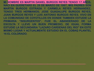 El documento presenta la biografía de un estudiante de 17 años llamado Martín Daniel Burgos Reyes. Nació en Querétaro en 1997 y actualmente estudia en el COBAQ Plantel 16. Cursó la primaria y secundaria en la comunidad de Coyotillos, donde actualmente vive con sus padres y tres hermanos.