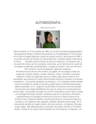 Nayely Pérez Fuentes nació en Puebla en 1998. Vivió con sus padres en la misma casa desde su nacimiento. Tuvo una hermana que murió de pequeña. De niña, jugaba con amigas a juegos populares como la pelota, la cuerda y las muñecas. Estudió en el kínder Casa Blanca y luego en la primaria Juan Crisóstomo Bonilla, donde ganó premios de dibujo y de escoltas. Actualmente cursa la secundaria en el Centro Escolar Manuel Espinoza Yglesias.