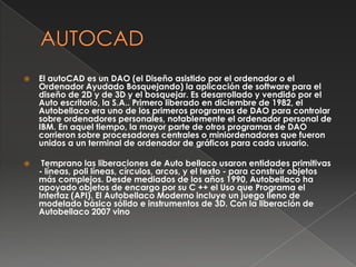 El documento proporciona información sobre AutoCAD, un software de diseño asistido por computadora desarrollado por Autodesk. Explica que AutoCAD permite crear dibujos 2D y 3D usando entidades geométricas básicas. También describe brevemente la historia de AutoCAD y Autodesk, incluyendo versiones como AutoCAD LT y versiones para estudiantes.