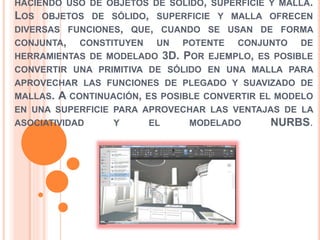 Este documento describe las funciones básicas de modelado 3D en AutoCAD, incluyendo la creación de objetos de sólido, superficie y malla, y cómo se pueden convertir entre sí para aprovechar diferentes ventajas. También incluye un ejemplo práctico de modelado 3D en AutoCAD.
