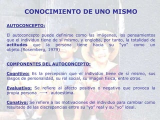 El documento habla sobre el autoconcepto y la autoestima. Explica que el autoconcepto se refiere a las imágenes y pensamientos que una persona tiene de sí misma, mientras que la autoestima es la evaluación que hace una persona de su propia competencia y valor. También describe los componentes, niveles y factores que influyen en el desarrollo del autoconcepto y la autoestima a lo largo de la vida. Finalmente, señala que aunque la autoestima se forma a través de experiencias de vida, es posible reconstruirla mediante la mod