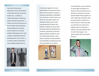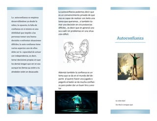La autoconfianza se refiere a la convicción privada de que una persona puede tener éxito al realizar una tarea o tomar una decisión difícil. Se desarrolla desde la niñez y depende de factores como la familia, los valores enseñados en el hogar y la capacidad de actuar independientemente. La autoconfianza permite a las personas expresar sus puntos de vista con seguridad ante diferentes audiencias y circunstancias, como hablar en público sin titubeos, al sentirse valiosos y con habilidades similares a los demás.