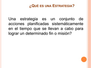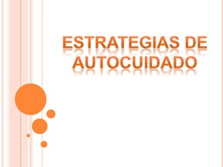 El documento define estrategia como un conjunto de acciones planificadas sistemáticamente para lograr un objetivo. Explica que el autocuidado implica asumir la responsabilidad de elegir estilos de vida y trabajo saludables dentro de las propias limitaciones. Finalmente, señala que el estrés y el síndrome de burnout son riesgos psicosociales que requieren autocuidado para prevenir problemas de salud.