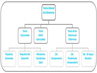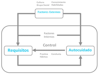 La teoría del autocuidado de la salud fue conceptualizada por Dorotea Orem y se refiere a las actividades que las personas aprenden y realizan por sí mismas para mantener su bienestar físico y mental. Orem describió tres tipos de requisitos para el autocuidado: requisitos universales comunes a todos, requisitos del desarrollo y requisitos por alteraciones o desviaciones de salud. El autocuidado implica el desarrollo de prácticas y hábitos orientados a la salud y el bienestar individual.