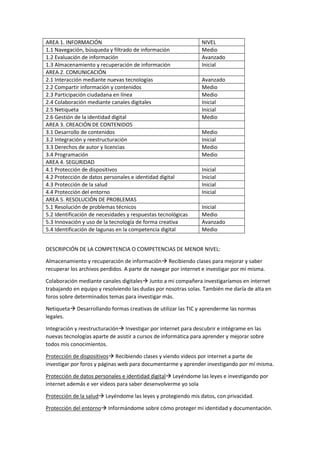 Este documento evalúa las competencias digitales de una persona en 5 áreas principales: información, comunicación, creación de contenidos, seguridad y resolución de problemas. En general, la persona tiene un nivel medio-avanzado en la mayoría de las competencias, excepto en almacenamiento y recuperación de información, colaboración mediante canales digitales, netiqueta, integración y reestructuración, protección de dispositivos, protección de datos personales e identidad digital, protección de la salud, protección del entorno y resolución de problemas