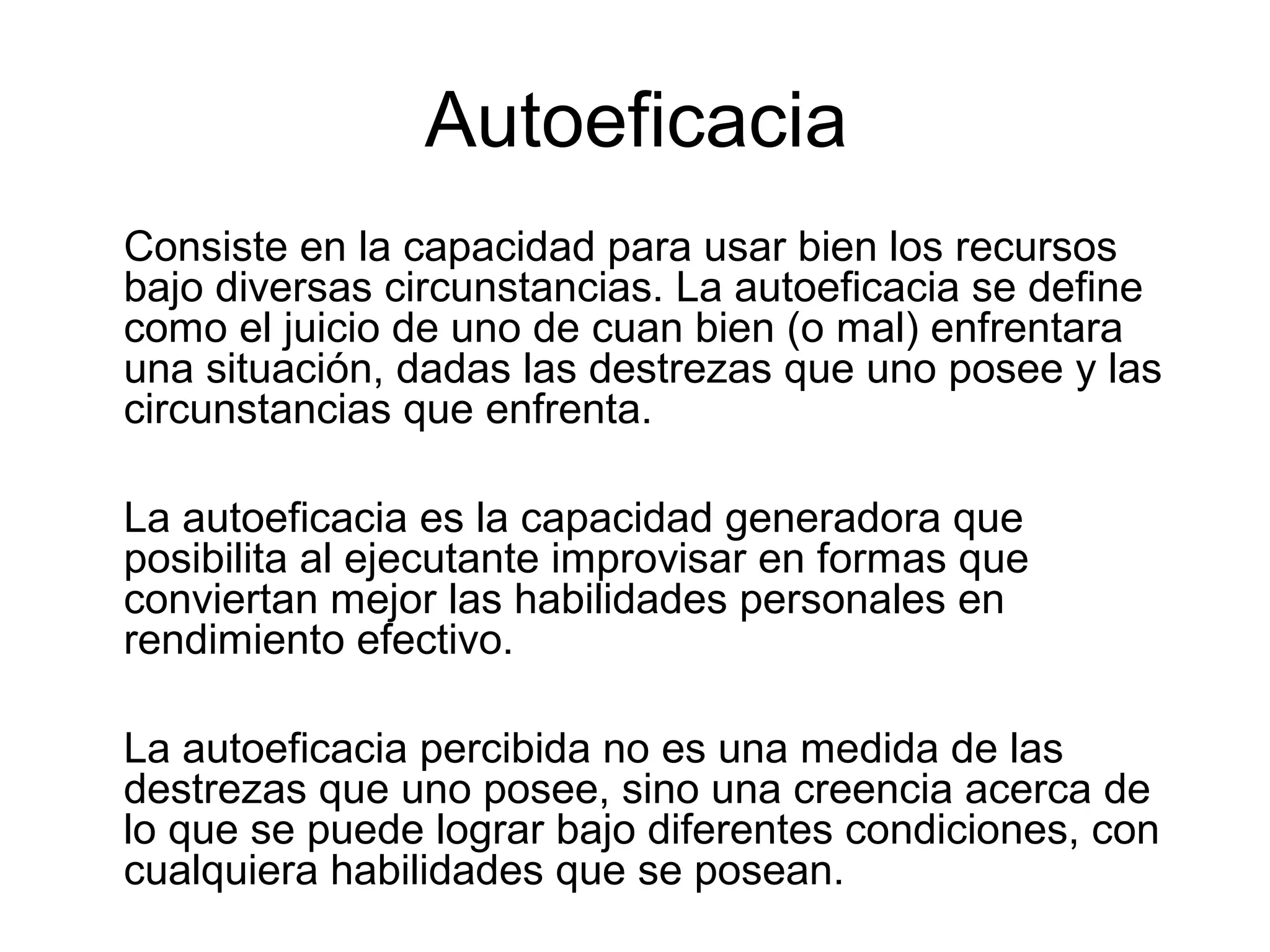 La autoeficacia se refiere a la creencia de una persona sobre su capacidad para organizar y ejecutar los cursos de acción requeridos para producir resultados deseados bajo diferentes condiciones. Las creencias de autoeficacia afectan la elección de actividades, el esfuerzo y la perseverancia, el pensamiento y la toma de decisiones, y las reacciones emocionales de una persona. Una autoeficacia más fuerte conduce a un mejor rendimiento y desarrollo personal.
