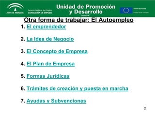 El documento describe los aspectos clave de iniciar un negocio propio como autoempleado, incluyendo características del emprendedor, ideas de negocio, conceptos sobre empresas, planes de empresa, formas jurídicas, trámites y ayudas. Se enfoca en temas como el emprendedor, la idea de negocio, los recursos de la empresa, funciones como producción y ventas, y consideraciones administrativas como contabilidad y personal.