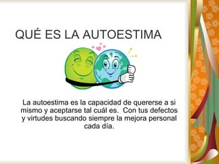 QUÉ ES LAAUTOESTIMA La autoestima es la capacidad de quererse a si mismo y aceptarse tal cuál es. Con tus defectos y virtudes buscando siempre la mejora personal cada día.