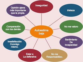 AUTOESTIMA BAJA Una personacon autoestima baja se caracteriza por: No quererse tal y como es. Sentirse mal con su cuerpo y con su personalidad. Se encuentra insatisfecho y quizás decepcionado de si mismo. No se siente capaz de lograr el éxito y culpa a los demás de sus debilidades.
