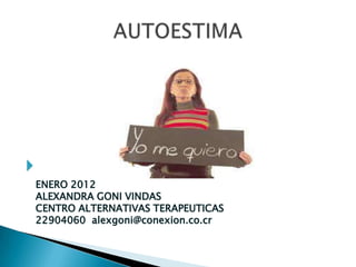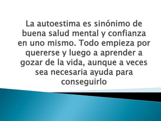 El documento trata sobre la autoestima y cómo desarrollarla. La autoestima se refiere a la confianza y respeto por uno mismo. Desarrollar una alta autoestima significa creer que uno es competente y merece ser feliz, lo que lleva a enfrentar la vida con más confianza, benevolencia y optimismo. Cuanto más alta sea la autoestima de una persona, mejor podrá manejar las adversidades y experimentar alegría.