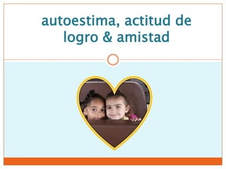 El documento habla sobre la amistad, la actitud de logro y la autoestima en los niños. Explica que la amistad se basa en la comunicación, el apoyo mutuo y la armonía. También describe que la actitud de logro empieza en casa cuando se reconocen los logros de los niños y puede llevarlos a sentirse más seguros y capaces. Además, resalta la importancia de reconocer los logros de los niños para ayudar al desarrollo de su confianza.