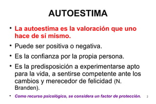 Este documento habla sobre la autoestima. Define la autoestima como la valoración que una persona tiene de sí misma y puede ser positiva o negativa. Explica que la autoestima se basa en necesidades, deseos, habilidades y limitaciones reales de una persona y que está influenciada por la retroalimentación y opiniones de otros. Por último, ofrece algunos consejos para mejorar la autoestima como tomar conciencia de los logros propios, aceptarse a uno mismo y confiar en las propias capacidades.