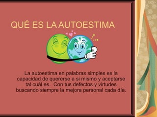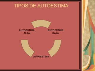 El documento habla sobre la autoestima y sus diferentes tipos. La autoestima alta se caracteriza por amarse a sí mismo, sentirse bien con uno mismo y creerse capaz de lograr metas. La autoestima baja se caracteriza por lo contrario: no quererse a sí mismo y sentirse incapaz. Para mejorar la autoestima baja, es importante dejar de darle importancia a las opiniones de los demás y enfocarse en mejorar uno mismo a través del trabajo personal y el desarrollo de fortalezas.