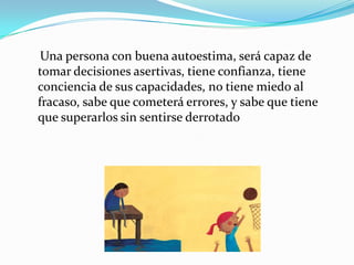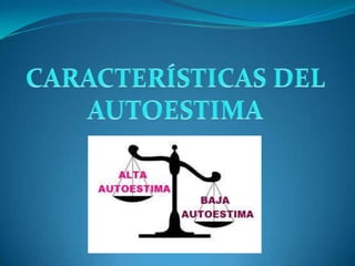 El documento describe las diferencias entre personas con alta y baja autoestima. Las personas con alta autoestima tienen confianza, asumen responsabilidades, afrontan metas con optimismo y aceptan sus capacidades y limitaciones. Por el contrario, las personas con baja autoestima tienen más tendencia a la depresión, dificultad para relacionarse con los demás y expresarse, y temor al fracaso.
