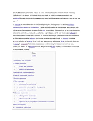 El documento define la autoestima y explica su importancia según diferentes teorías psicológicas como la pirámide de Maslow y la psicología humanista. Describe los grados de autoestima, incluyendo la autoeficacia y la autodignidad. También resume la escala de Rosenberg para medir la autoestima y explica cómo el sexo y la cultura pueden afectar la percepción de uno mismo.