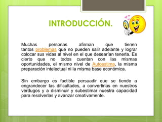 Este documento trata sobre la autoestima. Explica que la autoestima se forma desde la gestación y se ve influenciada por los mensajes que recibimos de nuestros padres. Describe comportamientos asociados con baja y alta autoestima y cómo la autoestima afecta las relaciones interpersonales como las de pareja y en el trabajo. Concluye que los niveles de éxito y calidad de vida están relacionados con una fuerte autoestima.