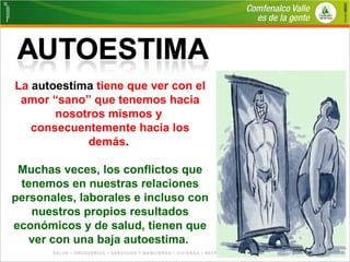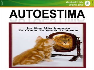 La autoestima está relacionada con el amor propio y las relaciones con los demás. Una baja autoestima puede causar conflictos personales y problemas de salud y económicos. Mejorar la autoestima implica trabajar en los componentes cognitivo, afectivo y conductual, modificando pensamientos y emociones negativas y comportamientos disfuncionales. Una autoestima positiva mejora la percepción de la realidad, las relaciones interpersonales y la tolerancia al estrés.