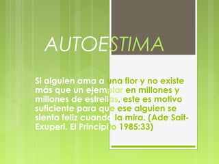 Los tres documentos tratan sobre el tema de la autoestima. El primero habla sobre cómo amar algo único puede ser suficiente para sentirse feliz. El segundo enfatiza la importancia de vivir en el presente en lugar de enfocarse en el pasado o futuro para ser más feliz. El tercero provee definiciones de autoestima que incluyen aceptarse a uno mismo, creer en el propio valor, y cómo uno se valora ante experiencias positivas y negativas.
