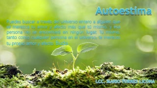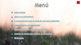 La autoestima se refiere al valor que una persona se atribuye a sí misma y a sus capacidades. Tiene dos dimensiones: el concepto propio y el amor propio. Una baja autoestima puede estar relacionada con problemas de salud como insomnio, hipertensión, depresión y trastornos alimenticios, e incluso un mayor riesgo de suicidio. La autoestima puede cambiar a lo largo del tiempo mediante hábitos de pensamiento.