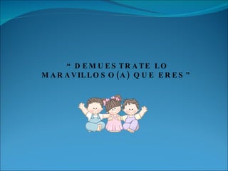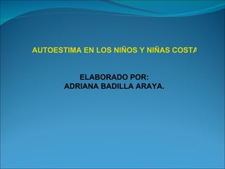 Este documento describe un proyecto social dirigido a niños en centros de nutrición en Costa Rica con el objetivo de fortalecer su autoestima. El proyecto incluye talleres que enseñan a los niños a valorarse a sí mismos. El documento también explica que la autoestima en los niños depende de las experiencias y opiniones de las personas cercanas y que afecta su comportamiento.