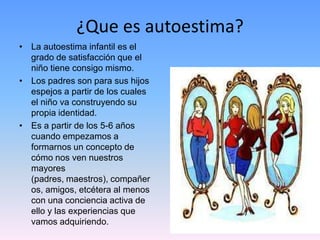 El documento describe los factores que influyen en la autoestima de los niños y las estrategias que los padres pueden usar para fomentar una alta autoestima. La autoestima de un niño depende de su imagen personal, sus relaciones con otras personas significativas y factores sociales. Los padres pueden mejorar la autoestima de sus hijos elogiándolos, tratándolos con respeto, estimulando su autonomía y apoyándolos cuando enfrentan obstáculos.