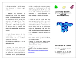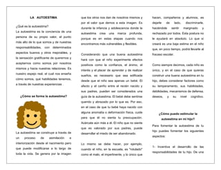 Este documento ofrece consejos para estimular la autoestima en los niños. 1) Anima a los niños a tomar decisiones y resolver problemas por sí mismos. 2) Refuerza con positivismo las buenas conductas del niño. 3) Establece límites claros y enseña las consecuencias de las acciones.