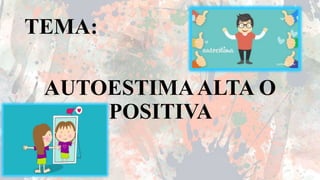 Este documento trata sobre las estrategias para fomentar una autoestima alta. En el hogar, se recomienda establecer momentos de comunicación, dejar que el niño evolucione solo, recurrir al cariño y el refuerzo positivo, y animarle a preocuparse por los demás. En la escuela, se sugiere mantener un contacto fluido con el alumno, adaptar los objetivos a sus posibilidades, y potenciar los refuerzos verbales y no verbales.