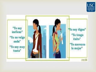 Este documento trata sobre la importancia de la autoestima y cómo puede verse afectada. En pocas oraciones: La autoestima se refiere a cómo nos vemos y valoramos a nosotros mismos, y puede verse afectada negativamente por factores como experiencias negativas en las relaciones o no satisfacer necesidades básicas, mientras que relaciones positivas y el logro de metas pueden mejorar la autoestima. También explora cómo la enfermedad puede dañar la autoestima de un paciente.