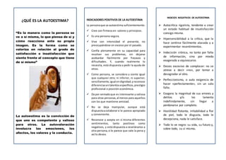 El documento ofrece recomendaciones para estimular la autoestima en uno mismo y en los demás, como valorar las fortalezas de las personas, aceptar sus debilidades, elogiar logros, evitar comparaciones y expresar emociones. También describe indicadores positivos de autoestima como confiar en sí mismo y reconocer la igualdad entre personas, e indicadores negativos como la autocrítica excesiva y el deseo de complacer a otros.