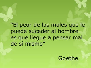 Este documento trata sobre el desarrollo de una autoestima positiva. Explica que la autoestima implica la evaluación positiva de uno mismo, la confianza en las propias capacidades y el valor que se da a sí mismo. Luego describe los pasos hacia una autoestima positiva, que incluyen el autoconocimiento, el desarrollo de un autoconcepto sano, la autoaceptación y el autorrespeto. Finalmente, contrasta las características de quien tiene una autoestima baja frente a quien tiene una autoestima alta y sana.