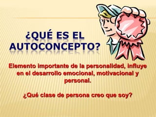 Este documento trata sobre el autoconcepto y la autoestima. Explica que el autoconcepto es un elemento importante de la personalidad que influye en el desarrollo emocional y personal. La autoimagen es la representación mental que tenemos de nosotros mismos tanto física como psicológicamente. La autoestima está formada por componentes cognitivos, conductuales y afectivos y depende de cómo nos vemos a nosotros mismos. La autoestima se forma principalmente en la infancia y adolescencia y puede ser alta, media o baja, influyendo