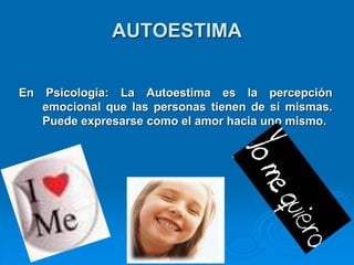 Este documento trata sobre la autoestima. Define la autoestima como la percepción emocional que las personas tienen de sí mismas y puede expresarse como el amor hacia uno mismo. Explica las causas de una baja autoestima como creencias inadecuadas, autoexigencias excesivas, y diálogos internos negativos. También describe las características de personas con baja y alta autoestima y ofrece recomendaciones para mantener una autoestima normal como ser conscientes de la propia capacidad y resiliencia.