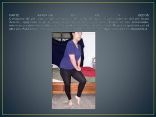 El documento aborda la importancia de los estiramientos para aumentar y mantener la flexibilidad en jóvenes y adultos, así como sus beneficios en la prevención de lesiones. Se describe la flexibilidad como una capacidad específica de cada articulación y se discute el reflejo de estiramiento que puede ser perjudicial si no se practica adecuadamente. Además, se presentan una serie de ejercicios detallados para estirar diferentes grupos musculares, enfatizando la forma correcta de realizarlos para maximizar sus beneficios.