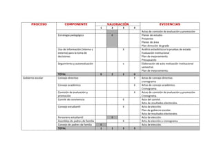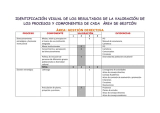 Este documento presenta los resultados de la valoración de los procesos y componentes de gestión de una institución educativa. Se evalúan áreas como gestión directiva, académica, administrativa y financiera, y de la comunidad. La mayoría de los componentes recibieron una valoración de 3, lo que indica un cumplimiento adecuado. Algunas áreas que requieren mejora son cultura institucional, clima escolar y relaciones con el entorno. En general, la institución muestra un desempeño aceptable en la mayoría de sus procesos