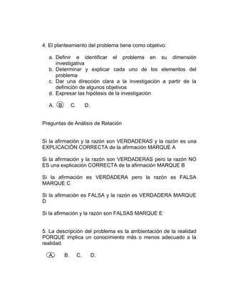 El documento presenta los pasos para identificar y definir un problema de investigación. Estos incluyen considerar si el problema puede ser observado y analizado, delimitar el tema, analizar temas relacionados y los objetivos de la investigación. También cubre cómo definir el título de la investigación de maneras atractivas, sintéticas o por antítesis, síntesis o asociación. Finalmente, identifica tres fuentes para el tema de investigación: vacíos en el conocimiento, resultados contradictorios o atracción por el tema.