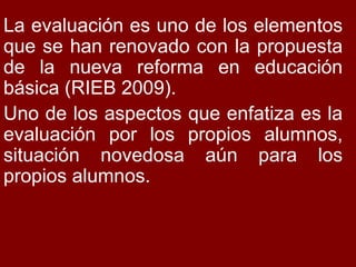 El documento aborda la autoevaluación del estudiante en el marco de la reforma integral de la educación básica (RIEB) de 2009, enfatizando la importancia de que los alumnos participen en su propio proceso formativo. Se detallan objetivos, metodología y criterios para implementar esta autoevaluación en un curso de maestría en educación básica. Además, se presenta la necesidad de los estudiantes de buscar información en línea y elaborar un formato de autoevaluación que refleje sus logros y dificultades.
