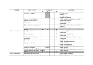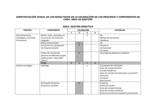 El documento presenta los resultados de la valoración de los procesos y componentes de las áreas de gestión de una institución educativa. En cada área se evalúan los diferentes procesos que la componen y se asigna una calificación. En general, los procesos más fuertes son el gobierno escolar, la cultura institucional y las relaciones con el entorno, mientras que las oportunidades de mejora se encuentran en el diseño pedagógico, las prácticas pedagógicas y el seguimiento académico. Finalmente, se