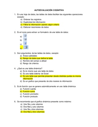 El documento presenta una autoevaluación sobre tablas dinámicas y macros en Excel. La autoevaluación contiene 10 preguntas de opción múltiple sobre las características y funciones de tablas de datos, tablas dinámicas, gráficos dinámicos y macros. También incluye preguntas de reflexión sobre lo más fácil, difícil y recomendaciones para aprender sobre estos temas. El estudiante deberá discutir sus respuestas en clase para compartir experiencias de aprendizaje.
