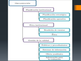 El documento describe el proceso de autoevaluación institucional de una universidad en Ecuador. Explica que la autoevaluación identifica las fortalezas y debilidades de la institución para proponer mejoras. Detalla que la autoevaluación involucra a docentes, estudiantes, graduados y autoridades, y que evalúa criterios como organización, academia, investigación, vinculación, recursos e infraestructura y estudiantes. Finalmente, indica que el informe de autoevaluación presenta las conclusiones consensuadas sobre el desempeño de la universidad